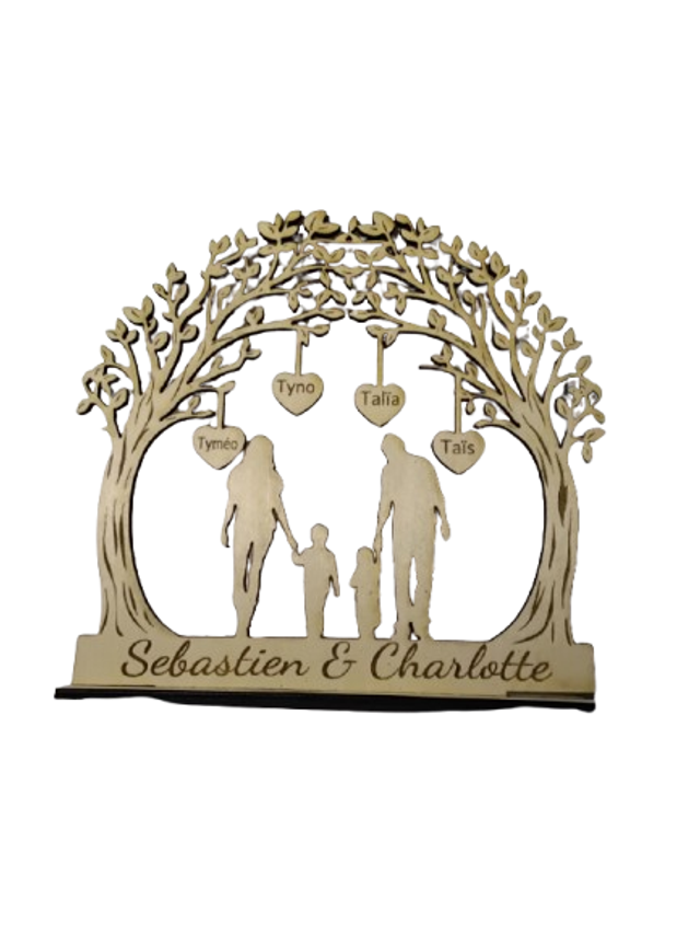 Cette arche arbre de vie représente votre famille grâce à des petits cœurs gravés avec les prénoms des enfants (de 1 à 5 et plus sur demande) ainsi que les prénoms des parents.