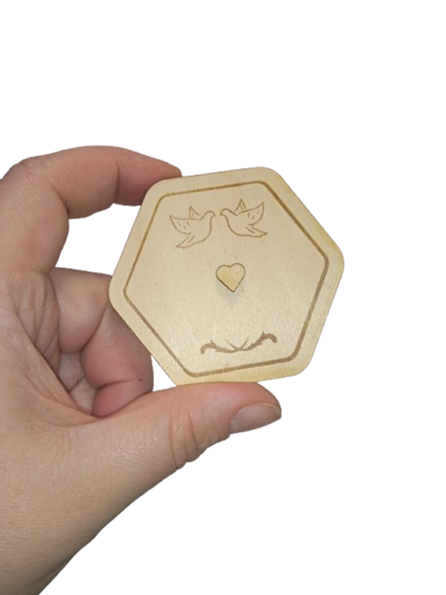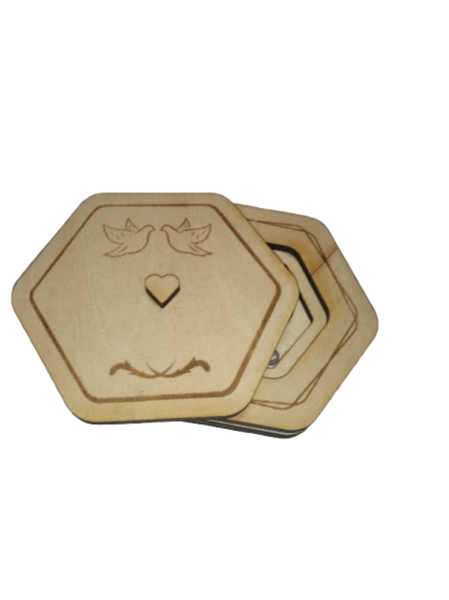 Faite à la main avec un souci du détail exceptionnel, cette boîte hexagonale marie simplicité et raffinement. Son couvercle gravé de motifs délicats – feuilles et cœur – évoque une touche naturelle et romantique.