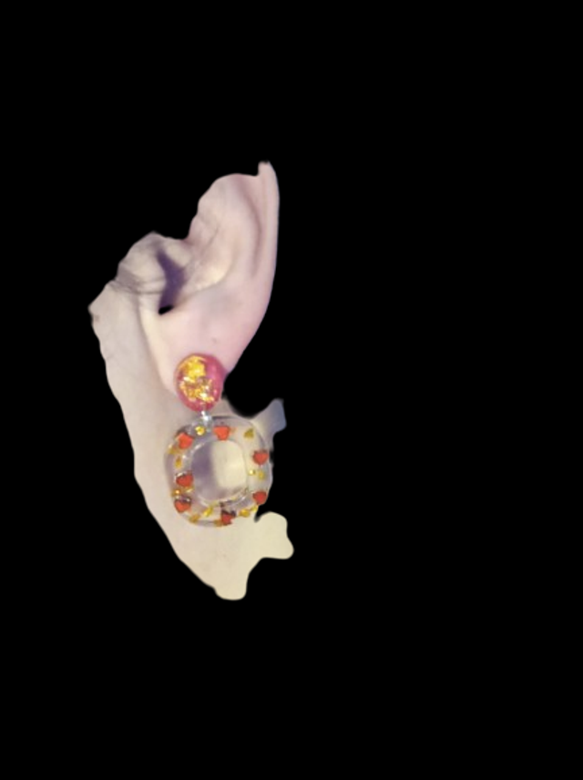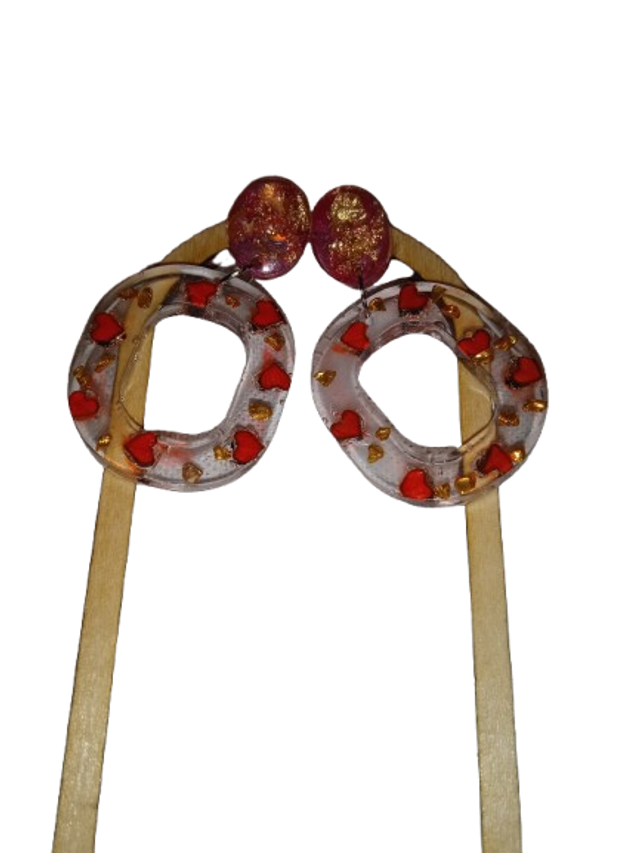 Ces boucles d'oreilles captivantes marient la transparence élégante de la résine et la chaleur naturelle du bois pour un design raffiné et artisanal. Les parties en résine transparente sont ornées de cœurs rouges et de fines feuilles dorées, ajoutant une touche romantique et scintillante. Les attaches supérieures, ovales et aux motifs scintillants roses et dorés, complètent harmonieusement l'esthétique lumineuse des boucles. Fabriquées à la main dans mon atelier en Sarthe, en France, elles offrent un savoir-faire unique et des attaches hypoallergéniques en acier inoxydable, idéales pour les peaux sensibles.