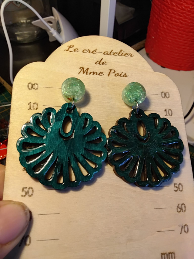 Boucles d’oreilles Bohèmes Vert Émeraude – Résine Pailletée & Bois Peint