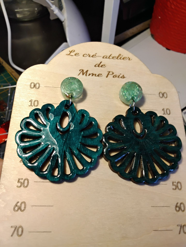 Ces boucles d’oreilles style bohème se distinguent par l’élégance de leurs matières et la profondeur de leur coloris. L’attache clou en résine verte pailletée apporte une touche lumineuse et raffinée, tandis que la partie inférieure en bois peint vert émeraude, recouverte de résine, offre un rendu naturel et harmonieux.