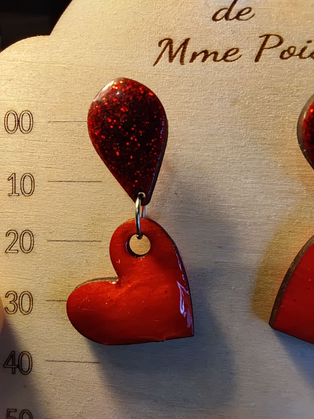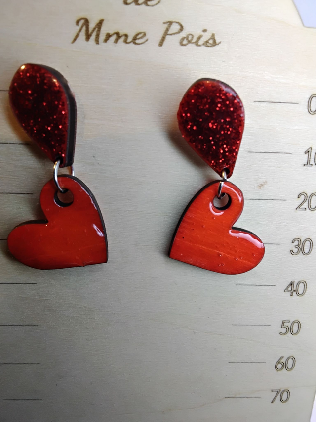 Boucles d’oreilles Cœur Goutte Rouge – Acier Inoxydable, Bois & Résine Pailletée