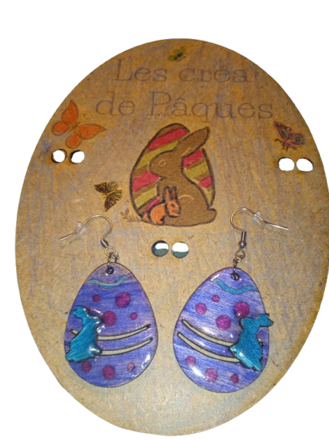 Boucles d’Oreilles œufs et lapin de Pâques – Bois et Résine Peints à la Main, Atelier Sarthe, Attache Acier Inoxydable