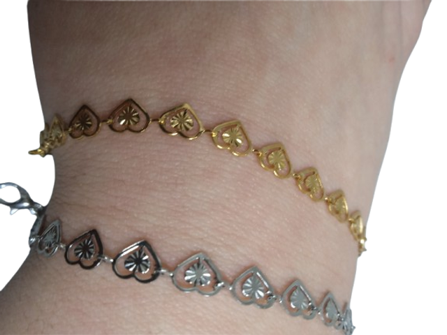 Ce bracelet en acier inoxydable, disponible en finition dorée ou argentée, présente des maillons élégants en forme de cœur qui symbolisent amour et raffinement.