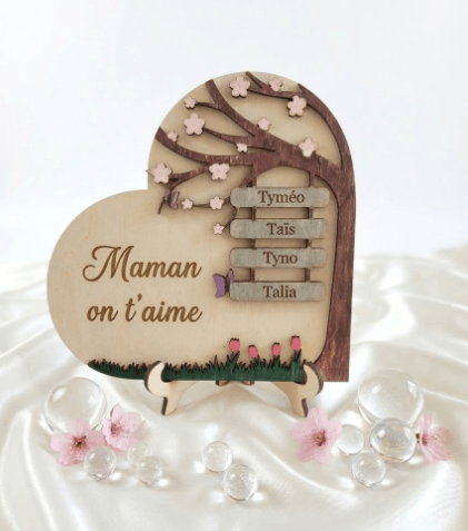 Notre cœur en bois gravé avec les prénoms de vos enfants